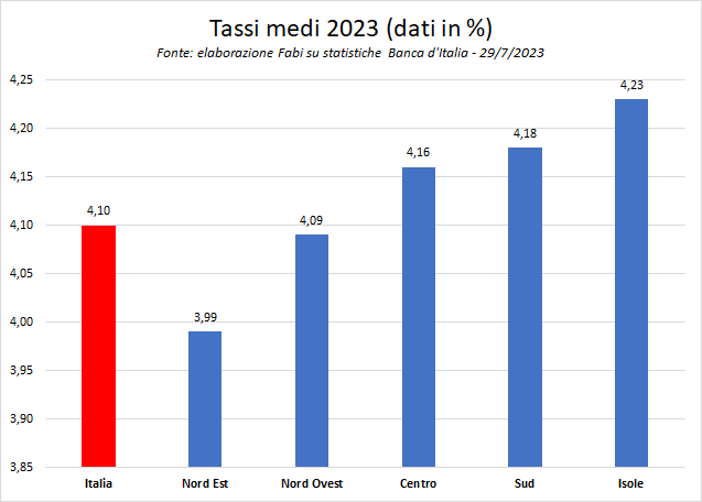 In base ai dati sui mutui della Banca d’Italia elaborati da Fabi, il tasso medio nazionale 2023 risulta essere pari al 4,10%. La rilevazione sulle aree geografiche esprime il grande divario tra il Nord Est (3,99%) e il Nord Ovest (4,09%) rispetto al Centro (4,16%), al Sud (4,18%) e, soprattutto, alle Isole che segnano 4,23%.